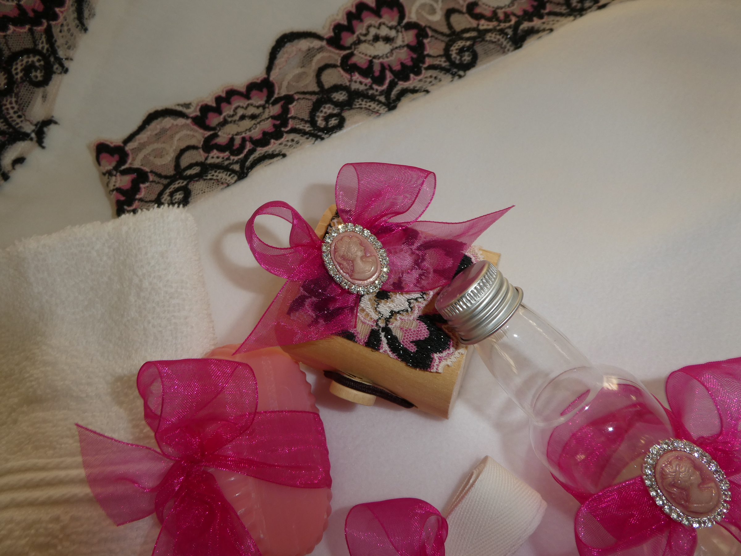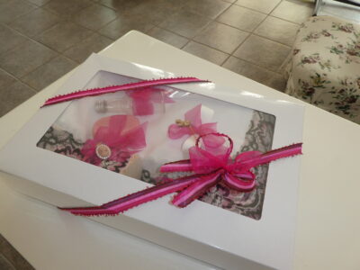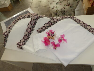 Continut: Paturica Basporata cu Dantela, Prosop Bebelus Basporat cu Dantela, Crisma Basporata cu Dantela, Prosop Preot, Fasa, Sapun preot, Cutie Suvita, Sticluta Apa Sfintita si Mir